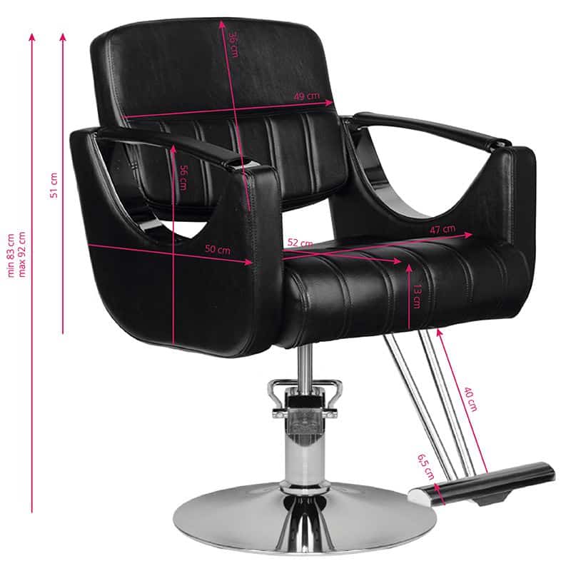 Moderen frizerski stol, je eleganten in zelo udoben. Trdno, kromirano podnožje zagotavlja stabilnost sedeža. Oblazinjenje iz visokokakovostnega črnega eko usnja. Sedež je nastavljiv gor in dol.