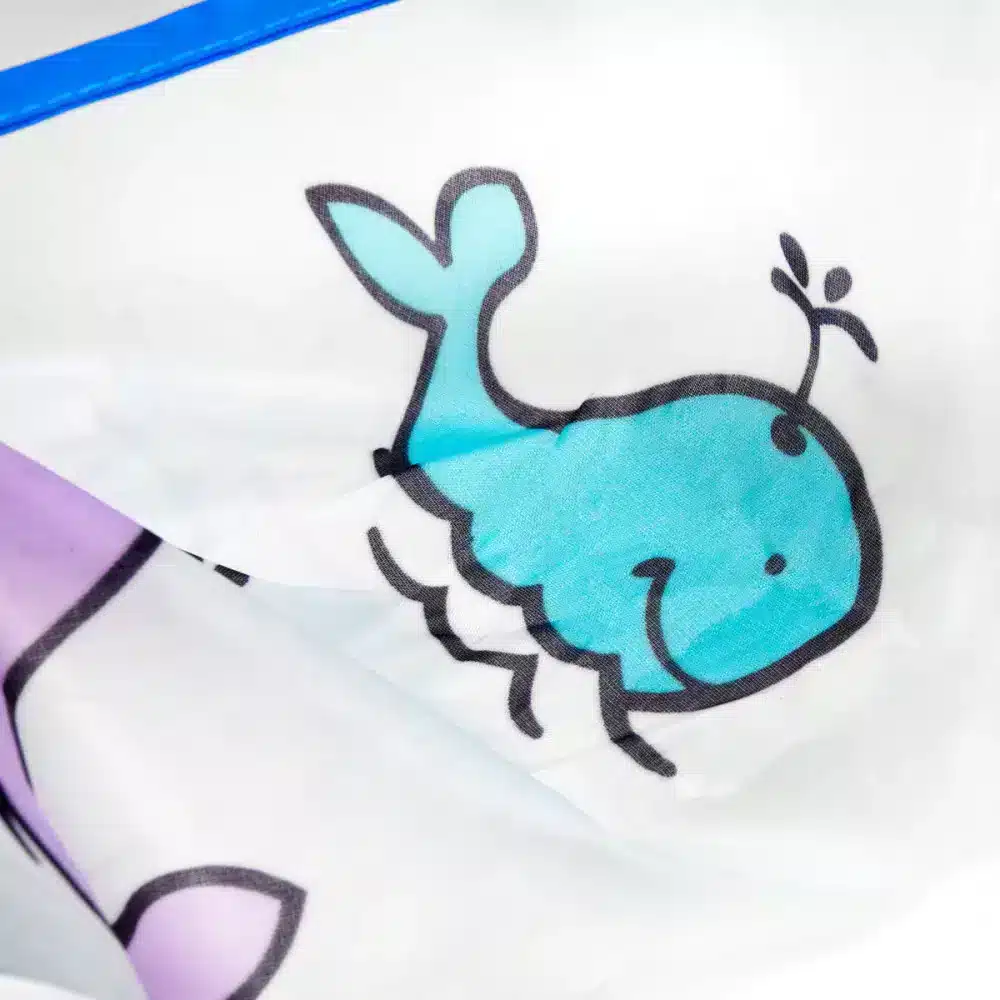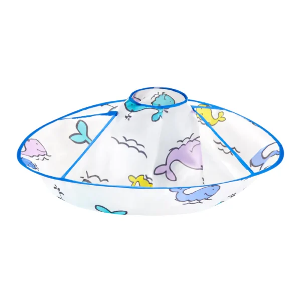 Udobno zapenjanje na ježka omogoča individualno prilagajanje vsaki mali stranki. Izdelek je izdelan iz vodoodpornega materiala , ki omogoča enostavno čiščenje . Prav tako ne prepušča vlage, kar ščiti oblačila pred mokroto med tretmaji . Dimenzije in izjemno enostavno zlaganje enostavno shranjevanje. Da bilo čim bolj privlačno za najmlajše, so na ogrinjalo natisnili motiv živalic – kite .