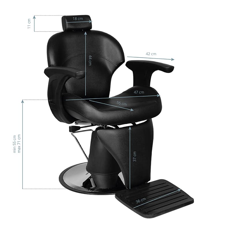 Novo v naši ponudbi – brivski stol Igor. Gre za sodoben, dovršen brivski stol, ki stranki salona nudi maksimalen občutek ugodja pri storitvah. Poleg nastavitve višine ima stol tudi nagibno naslonjalo. Kljub majhnim dimenzijam je možno stranko namestiti v udoben, napol ležeč položaj. Udoben sedež je prevlečen z visokokakovostnim eko usnjem. Široko, kromirano podnožje zagotavlja stabilnost stola med delom Dodatna prednost je možnost enostavne nastavitve naslona za glavo. Črno pohištvo.