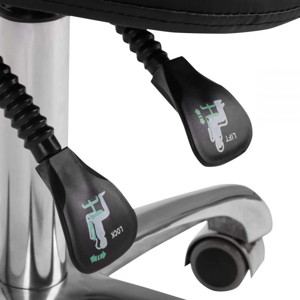 Udoben, ekskluziven, stabilen kozmetični stolček z naslonjalom in profiliranim sedežem, na zelo stabilnem peterokrakem podnožju. Nastavljiv v treh ravninah: